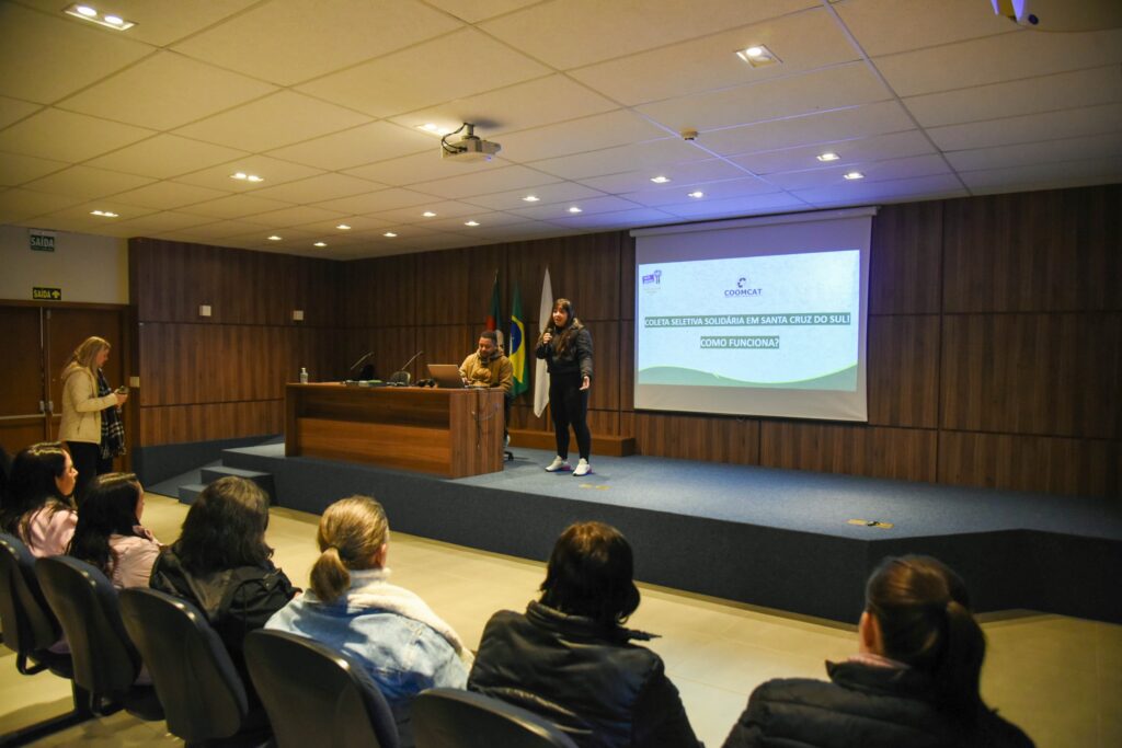 Cerca de 50 agentes comunitários de saúde participaram na manhã desta quinta-feira, dia 11, no auditório da Procuradoria-Geral do Município (PGM) de uma capacitação em serviço sobre coleta seletiva ministrada pela Secretaria Municipal de Meio Ambiente, Saneamento Sustentabilidade (Semmas) e pela Cooperativa dos Catadores e Recicladores de Santa Cruz do Sul (Coomcat). A ideia é que os profissionais da saúde que diariamente percorrem dezenas de moradias sejam multiplicadores nas comunidades onde atuam, ajudando as pessoas a separar corretamente os resíduos domésticos e contribuindo para elevar o índice de coleta de materiais recicláveis no município.