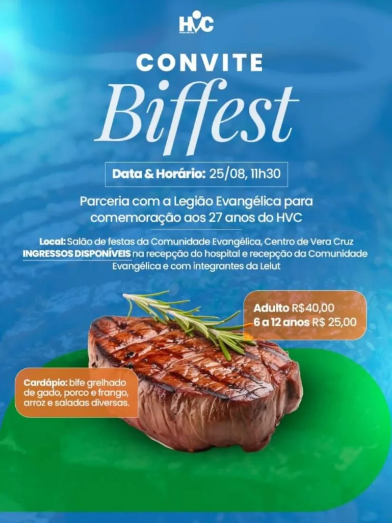 O cardápio da Biffest promete agradar todos os paladares, com opções de bife grelhado de gado, porco e frango, acompanhados por arroz e uma variedade de saladas. Os ingressos estão disponíveis na recepção do Hospital Vera Cruz, na recepção da Comunidade Evangélica, e também com os integrantes da Lelut. O valor do ingresso é de R$ 40 para adultos e R$ 25 para crianças de 6 a 12 anos.