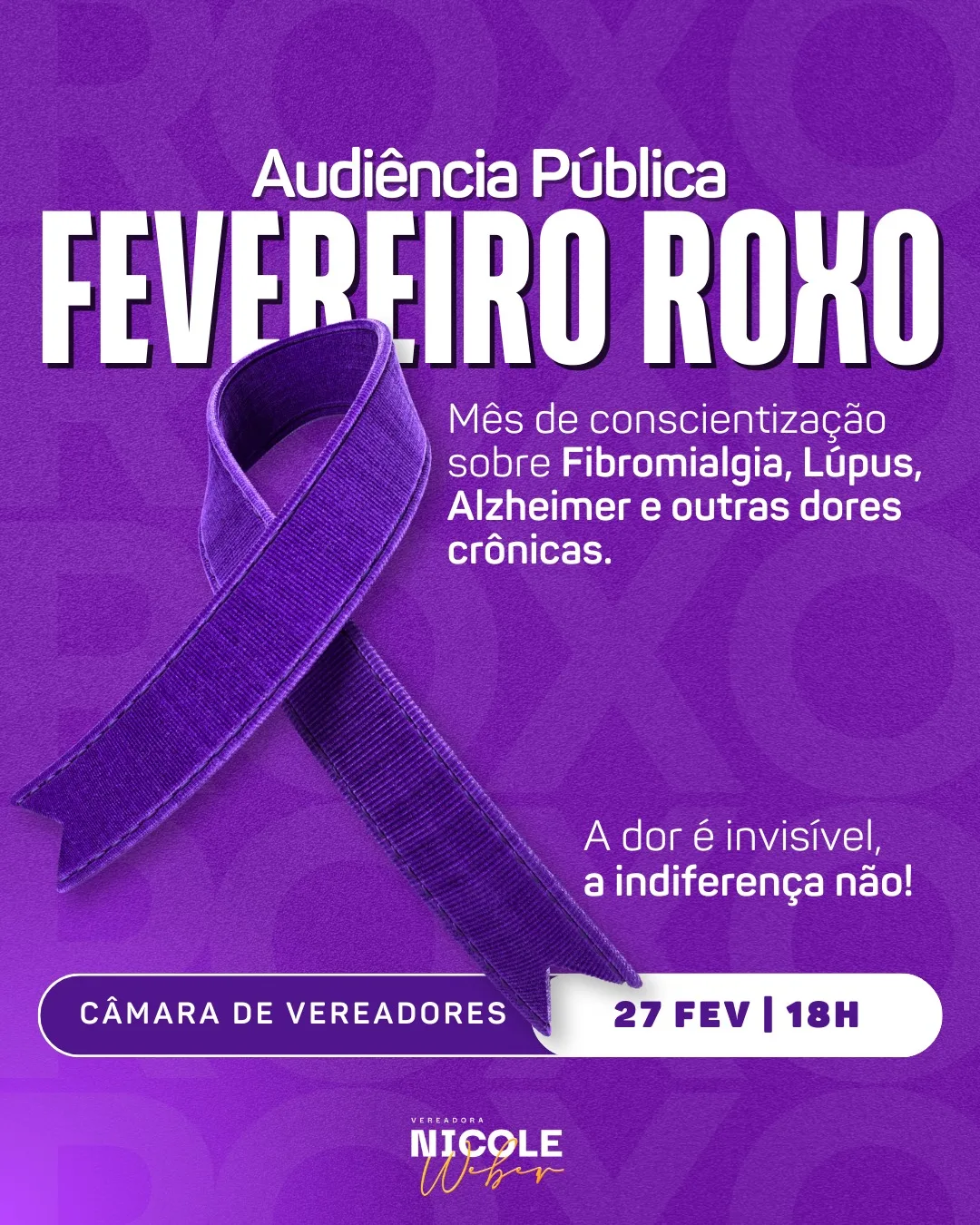 A proposta é da presidente do Poder Legislativo, Nicole Weber, que pretende atrair o olhar da comunidade para um problema invisível, mas muito grave na sociedade. “Queremos a participação das cidadãs e cidadão, autoridades e entidades para abordar diversas ramificações das dores que nos limitam tanto, mas que são totalmente invisíveis e afetam nosso dia a dia”, observou a presidente, que é fibromiálgica.