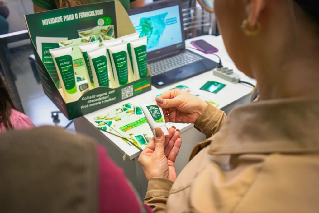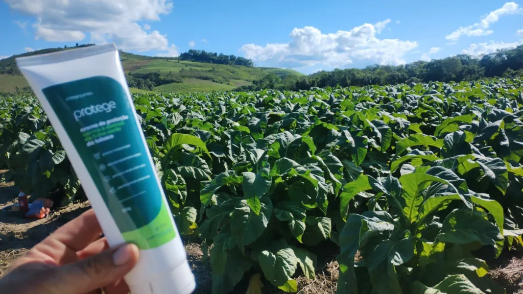 O Protege – O creme protetor de nicotina é um equipamento de proteção individual (CA 47844) que atua como uma barreira física e invisível na pele, barrando a entrada de nicotina no organismo do produtor de tabaco e prevenindo os incômodos relacionados com o chamado “porre do fumo” ou doença da folha verde do tabaco. O produto tem eficácia comprovada e já está sendo utilizado como estratégia de promoção de saúde pelos produtores, garantindo a ele segurança, conforto e bem-estar no campo.