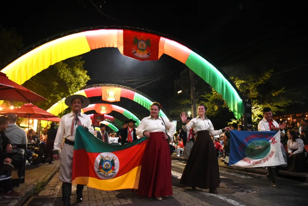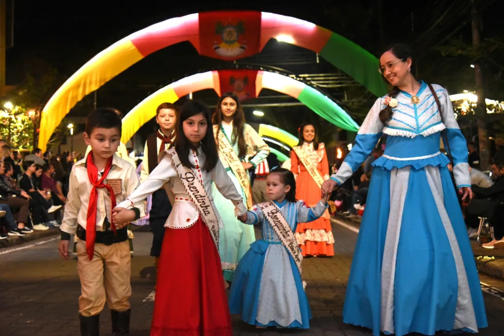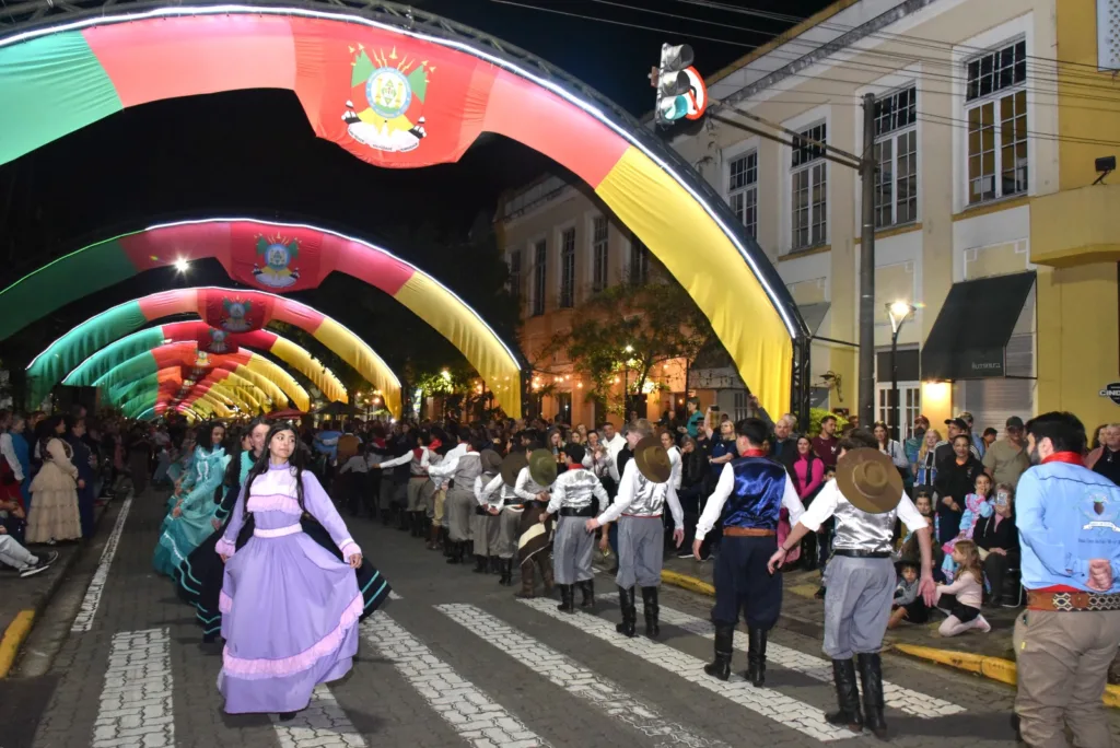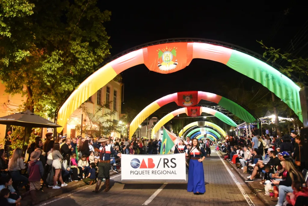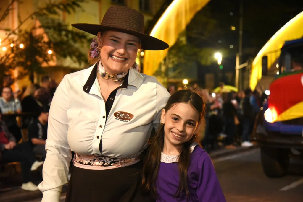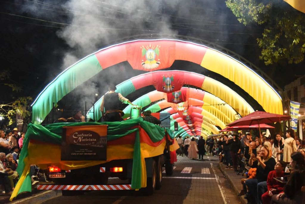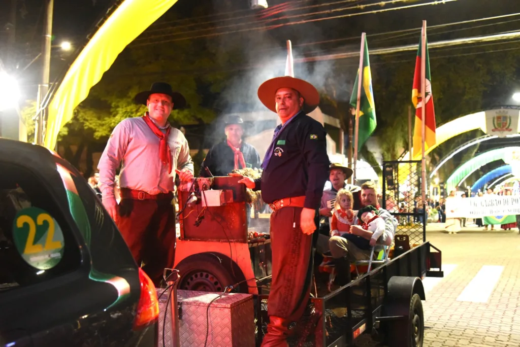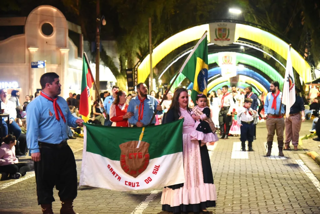 O primeiro desfile temático farroupilha noturno de que se tem registro em Santa Cruz do Sul reuniu milhares de pessoas na Rua Marechal Floriano, na noite desta terça-feira, 16. O espetáculo contou com 23 entidades tradicionalistas, que deram início ao cortejo por volta das 19h30, estendendo-se até depois das 21h. O público acompanhou cavalarianos, carros alegóricos, apresentações de dança e até churrasco sendo preparado na carroceria de caminhões.