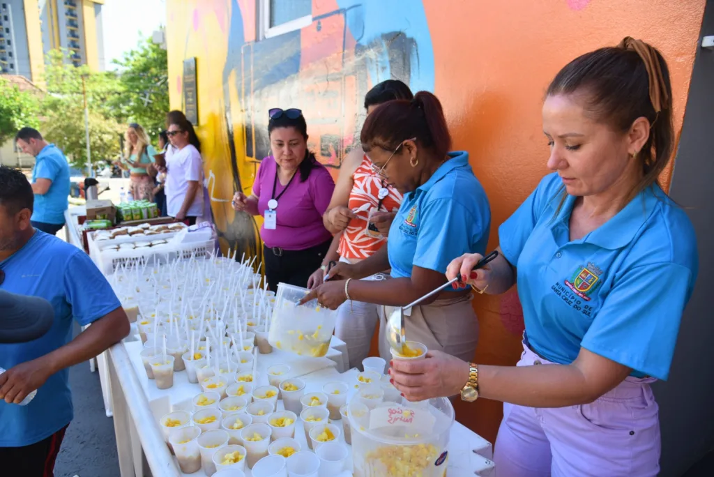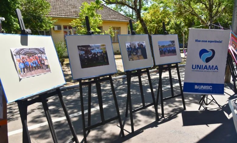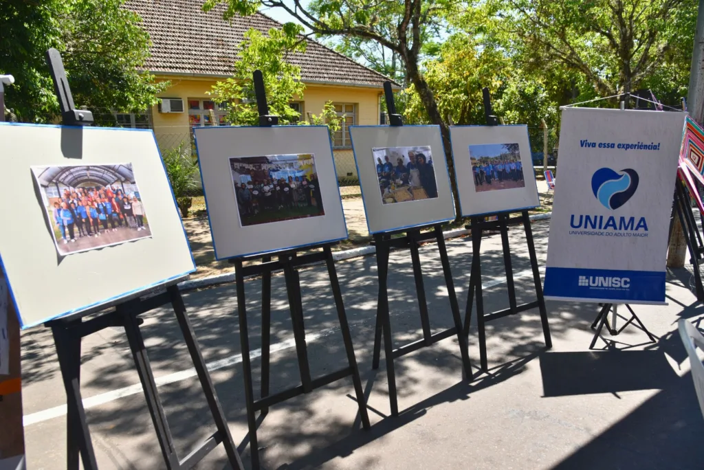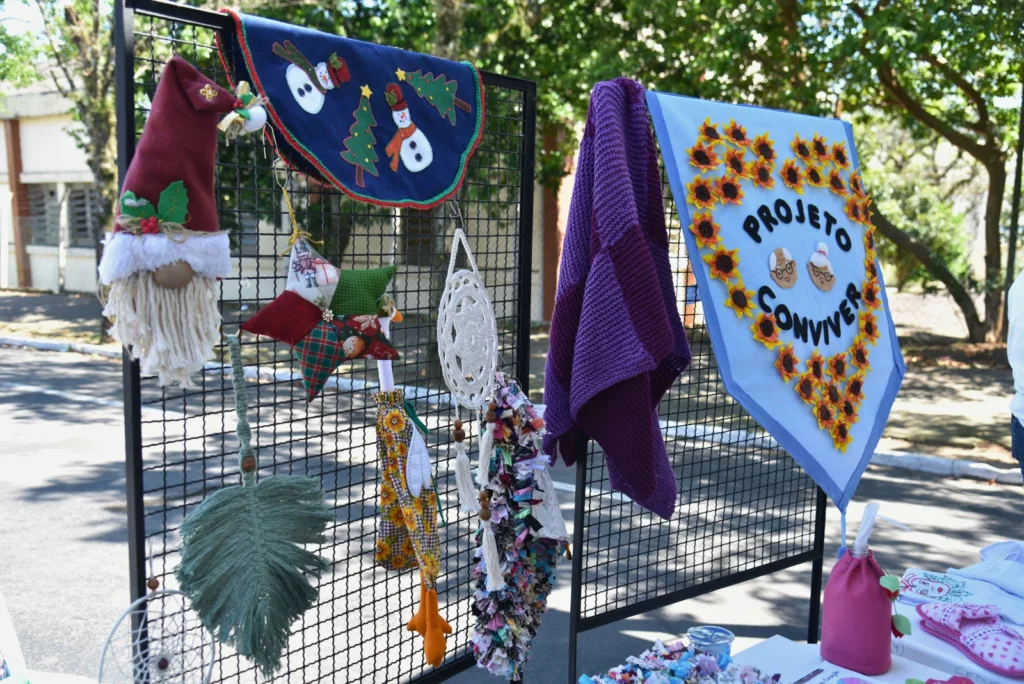 Na Rua Galvão Costa, defronte à praça, estavam os painéis com peças de artesanato e também fotografias das muitas atividades desenvolvidas ao longo do ano pelos grupos de idosos da Associação de Amparo à Terceira Idade (AATI), Apopesc, Hospital Beneficente Monte Alverne, Liga Feminina de Combate ao Câncer, Mitra Diocesana, Projeto Maturidade Esportiva da Secretaria Municipal de Desenvolvimento Social, Projeto Viver Melhor da Comunidade Apóstolo Paulo, Serviço de Convivência do Centro de Convivência da Melhor Idade e projeto Uniama da Unisc.
