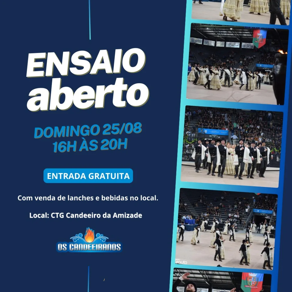 O evento, que ocorrerá na sede do CTG Candeeiro da Amizade, promete uma tarde de muita cultura e tradição, com ensaios abertos ao público.