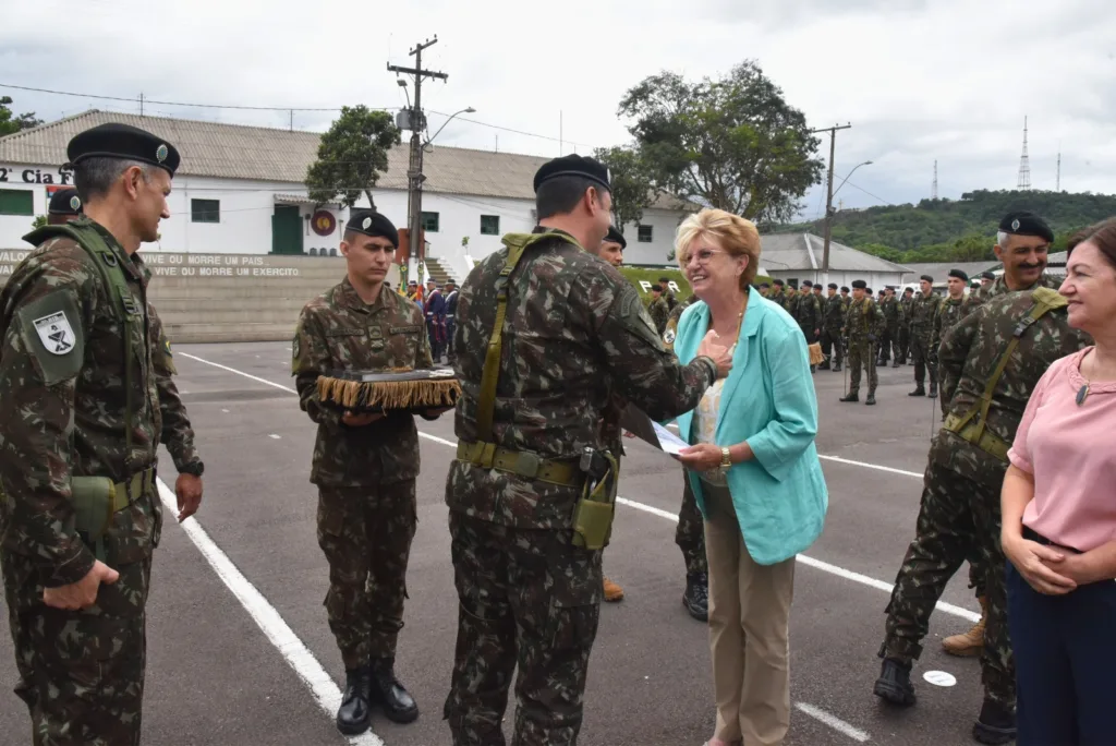 Na manhã desta sexta-feira, 8, o 7º Batalhão de Infantaria Blindado (BIB) realizou, em seu quartel, uma solenidade alusiva ao aniversário de nascimento do General Gomes Carneiro, patrono do 7º BIB, em comemoração aos 182 de criação desta organização militar. Durante o evento, a prefeita de Santa Cruz do Sul, Helena Hermany, junto de outras 34 pessoas, foi agraciada com o Diploma de Amigo do Batalhão, em reconhecimento ao trabalho conjunto de ajuda humanitária realizado durante as enchentes de maio deste ano.