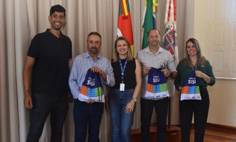 Na manhã desta quarta-feira, 22, o prefeito Sérgio Moraes recebeu, no Salão Nobre do Palacinho a gerente do Serviço Social da Indústria (Sesi), Carin Quoos e o analista de promoção da saúde, Giuliano Kolbe. Durante o encontro foi entregue o convite para prestigiar a Corrida do Sesi 2026, que ocorrerá no dia 24 de maio com largada às 7h, no Bairro Arroio Grande, em frente ao Centro Esportivo Sesi.