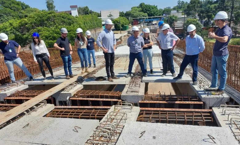 Nesta sexta-feira, 10, o prefeito Sérgio Moraes, e o vice-prefeito, Alex Knak, acompanhados dos secretários de Obras e Infraestrutura, Francisco Carlos Smidt, de Planejamento e Mobilidade Urbana, Vanir Ramos de Azevedo, por engenheiros da prefeitura, e por técnicos do Consórcio composto pelas empresas Giovanella e Porto Beton, estiveram no viaduto do Arroio Grande para averiguar o andamento da obra.