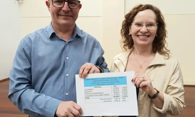A Universidade de Santa Cruz do Sul (Unisc) realizou nesta terça-feira, 11, o processo eleitoral para eleger os cargos da administração superior – reitor e vice-reitor – e para a administração básica – chefias de departamentos, coordenações dos cursos de graduação e coordenações dos Programas de Pós-Graduação Stricto Sensu (PPGs). O pleito teve chapa única em todos os cargos. Rafael Frederico Henn e Andréia Rosane de Moura Valim concorreram à reeleição e foram aprovados por 95,86% dos votantes. Votaram docentes; estudantes de graduação (presencial e EaD), de pós-graduação lato sensu (presencial e EaD) e de pós-graduação stricto sensu; técnicos administrativos; e representantes das entidades associadas efetivas da Assembleia Geral Comunitária da Apesc.