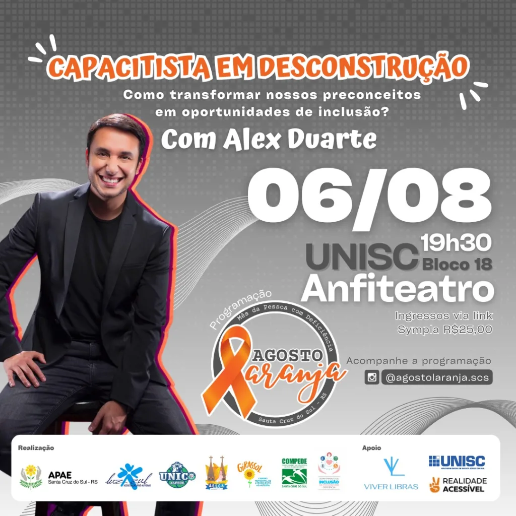 No dia 6 de agosto, haverá a palestra “Capacitista em Desconstrução” com Alex Duarte, um evento para todos que desejam entender melhor a importância da inclusão e do respeito às diferenças.