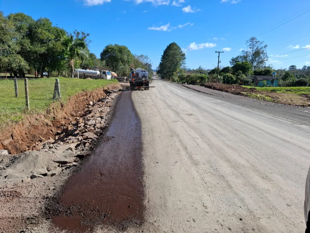 A semana começa com trabalhos de imprimação em mais um trecho na estrada de Linha Hansel em preparação ao recebimento da camada de asfalto. Por conta disso, o local está com trânsito em meia pista e a atenção de motoristas preciosa ser redobrada. A camada de imprimação e asfalto avança por cerca de mais dois quilômetros na via e a previsão é de que os trabalhos sejam executados durante toda a semana.