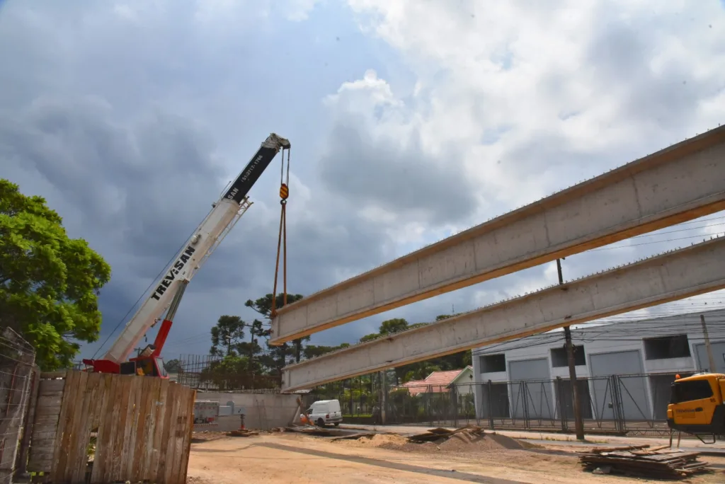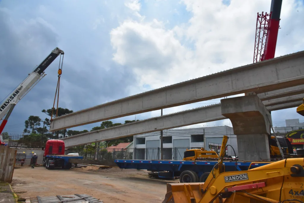 As vigas longarinas dão sustentação às lajes que compõem a pista sobre as quais os veículos irão se deslocar. Ao longo do dia, também teve prosseguimento a colocação das transversinas no vão 4, seguido da concretagem das mesmas, e a colocação das pré-lajes e armaduras da laje que integram a primeira parte (vão 5) do tabuleiro sobre o qual será construída a pista de rolamento para o trânsito dos veículos.