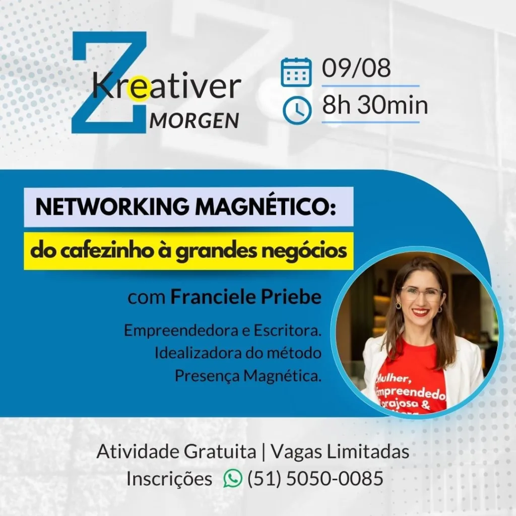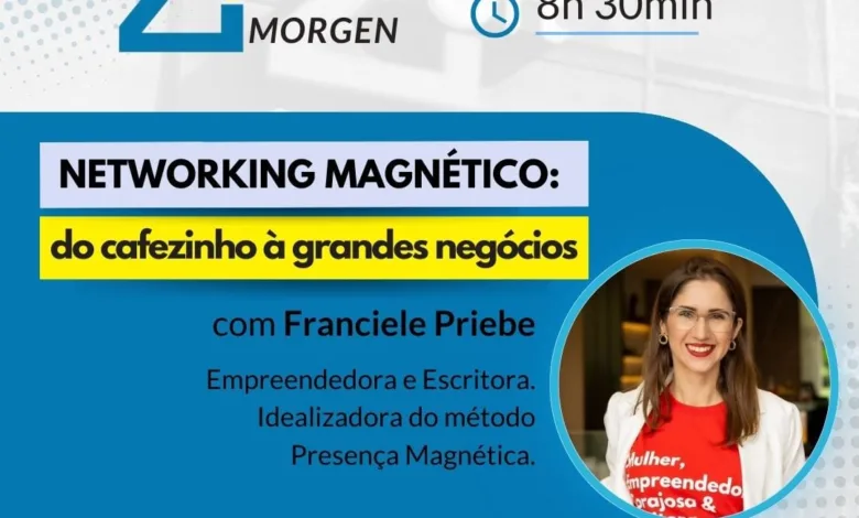Nesta edição, a convidada é a empreendedora e escritora Franciele Priebe, abordando o tema “Networking Magnético – do cafézinho à grandes negócios”. Franciele é criadora de um método chamado “presença magnética”, que também será abordado no evento.
