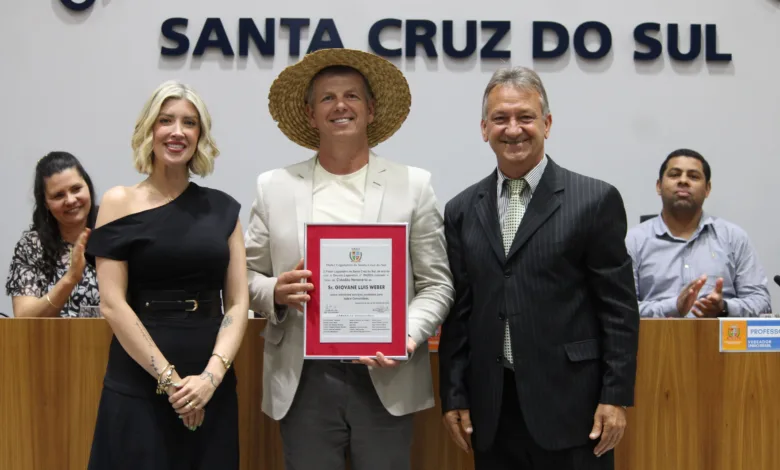 A Câmara Municipal de Vereadores de Santa Cruz do Sul realizou a entrega do título de Cidadão Honorário a Giovane Luis Weber. A honraria, proposta pelo vereador Ilário Keller (PP), reconhece os valiosos trabalhos e a significativa contribuição de Weber para o município, especialmente na defesa e valorização da agricultura familiar e da fumicultura.
