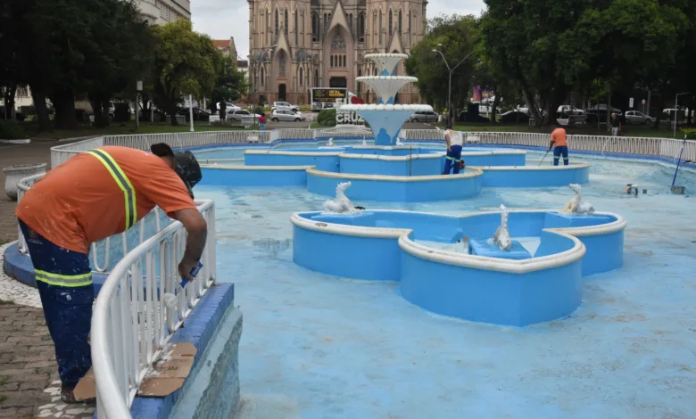 Equipes da Secretaria de Serviços Públicos realizam serviço de revitalização no chafariz da Praça Getúlio Vargas. Conforme o subsecretário da pasta, Dionatas Lopes, dentre as intervenções que serão realizadas estão a limpeza e a pintura do local.