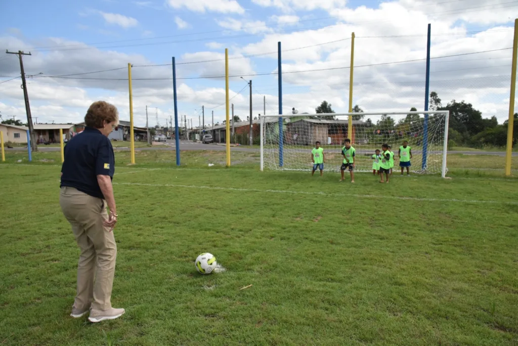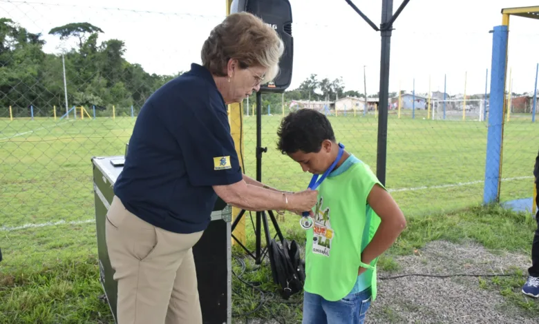 Após o solenidade, a prefeita fez chute a gol com a garotada no novo campo. Ela também entregou medalhas para as crianças que participam do projeto Craques da Bola.