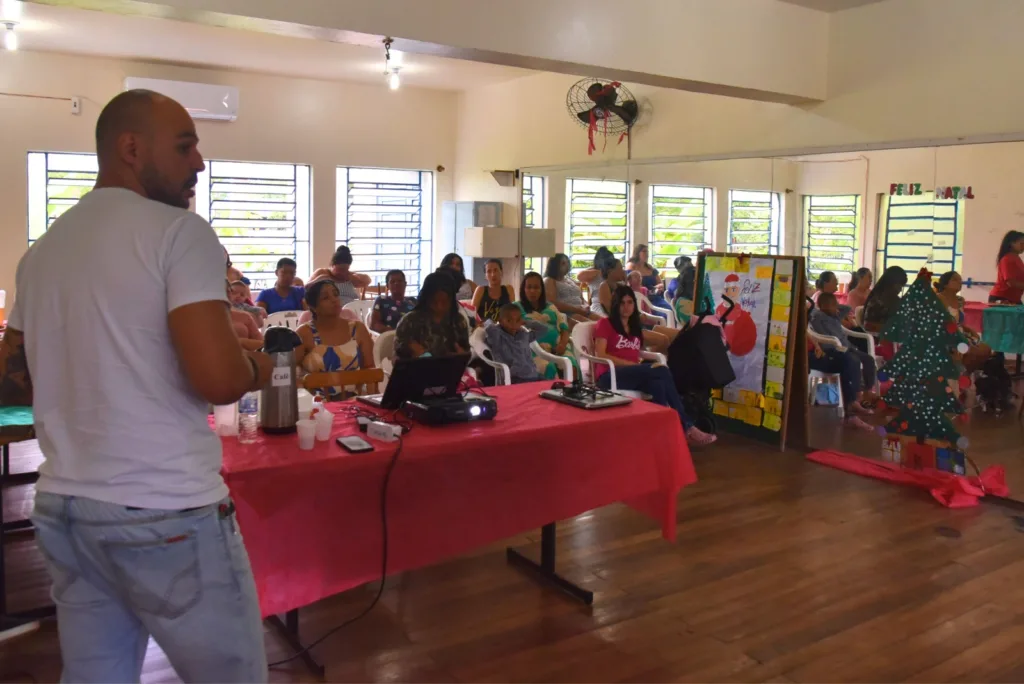 Os temas das capacitações são escolhidos pelas próprias gestantes, conforme suas necessidades, em um processo colaborativo. Elas trocam informações e experiências, o que fortalece a rede de apoio entre as participantes.