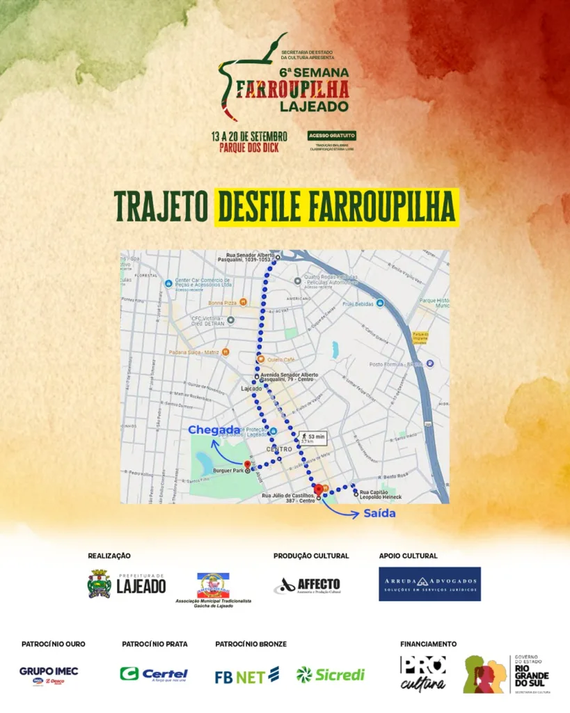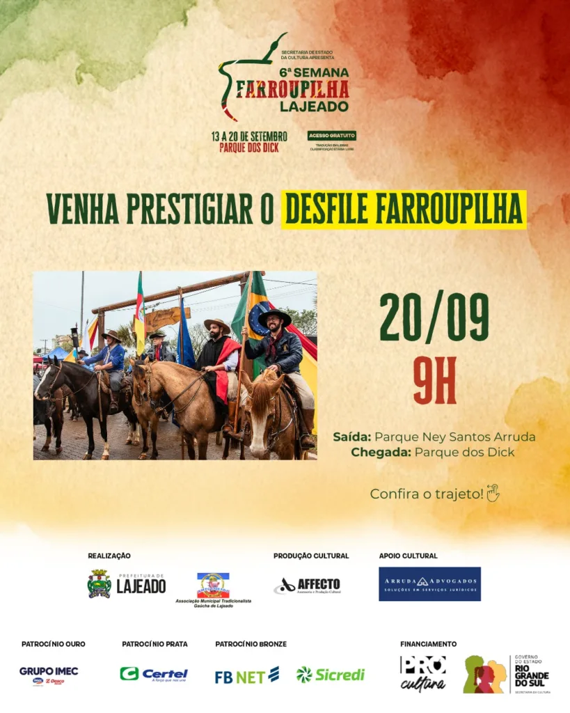 Para celebrar o Dia do Gaúcho, neste 20 de setembro, Lajeado realiza o tradicional Desfile Farroupilha, um dos momentos mais esperados da programação da 6ª Semana Farroupilha de Lajeado. O evento inicia às 9h e a concentração será no Parque Ney Santos Arruda, com saída da rua Capitão Leopoldo Heineck.