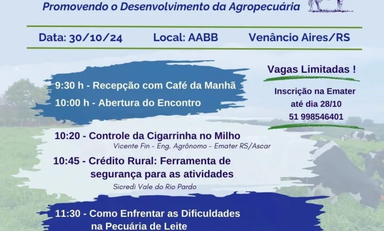 Conforme o engenheiro agrícola e extensionista rural da Emater RS/Ascar, Diego Barden dos Santos, será um evento importante voltado para o produtor leiteiro. “Mais um evento em prol dos produtores leiteiros, com palestra de qualidade e assuntos extremamente importantes que vão ajudar o produtor a melhorar, desenvolver e crescer na sua atividade leiteira. Todos os produtores de leite estão convidados, tanto de Venâncio Aires, como da região a participarem deste grande evento”, destaca Diego.
