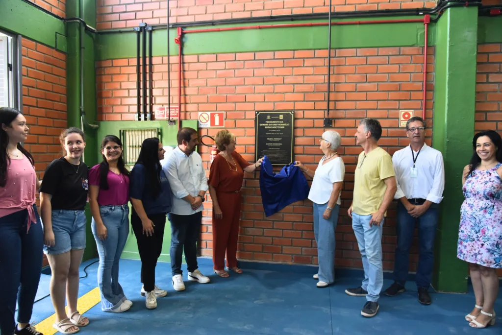 A reforma do ginásio de esportes incluiu fechamento e pintura da quadra, execução de banheiros, melhorias na acessibilidade, instalação de rede de hidrantes, sistema de alarme, além de instalações elétricas e hidrossanitárias.