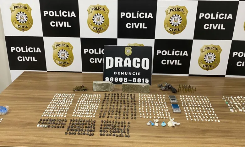 Durante o cumprimento das diligências, os agentes da DRACO, com apoio da Delegacia de Polícia de Passo do Sobrado, apreenderam 725 porções de cocaína, quatro buchas grandes da mesma droga, um revólver calibre .38, 22 munições do mesmo calibre, além de dois tijolos e uma porção de maconha, totalizando 1,307 kg.
