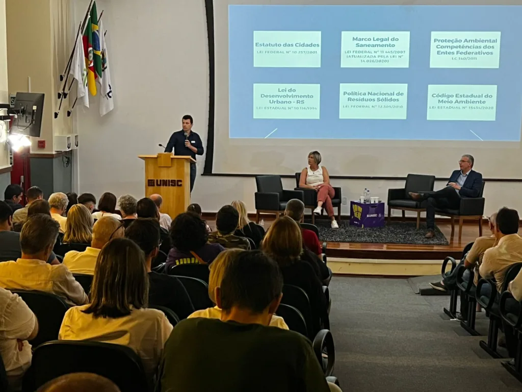 A governança e a educação ambiental ficaram com a apresentação do Comitê Pró-Clima e do Projeto Agenda Ambiental Cisvale 2030: um planeta saudável, um futuro sustentável, criado pelo consórcio ainda em 2023. A professora da Unisc Priscila Pacheco Mariani e o assessor jurídico do Cisvale, Diogo Durigon, alternavam-se nas apresentações. “O tema educação ambiental faz parte da nossa atuação, e tem como objetivo, promover a consciência para viabilizar o desenvolvimento sustentável da nossa região. Neste sentido, a Agenda Ambiental, projeto pioneiro do Cisvale, cumpre um papel socioambiental de grande relevância e importância”, pontua a diretora executiva do Cisvale, Léa Vargas.