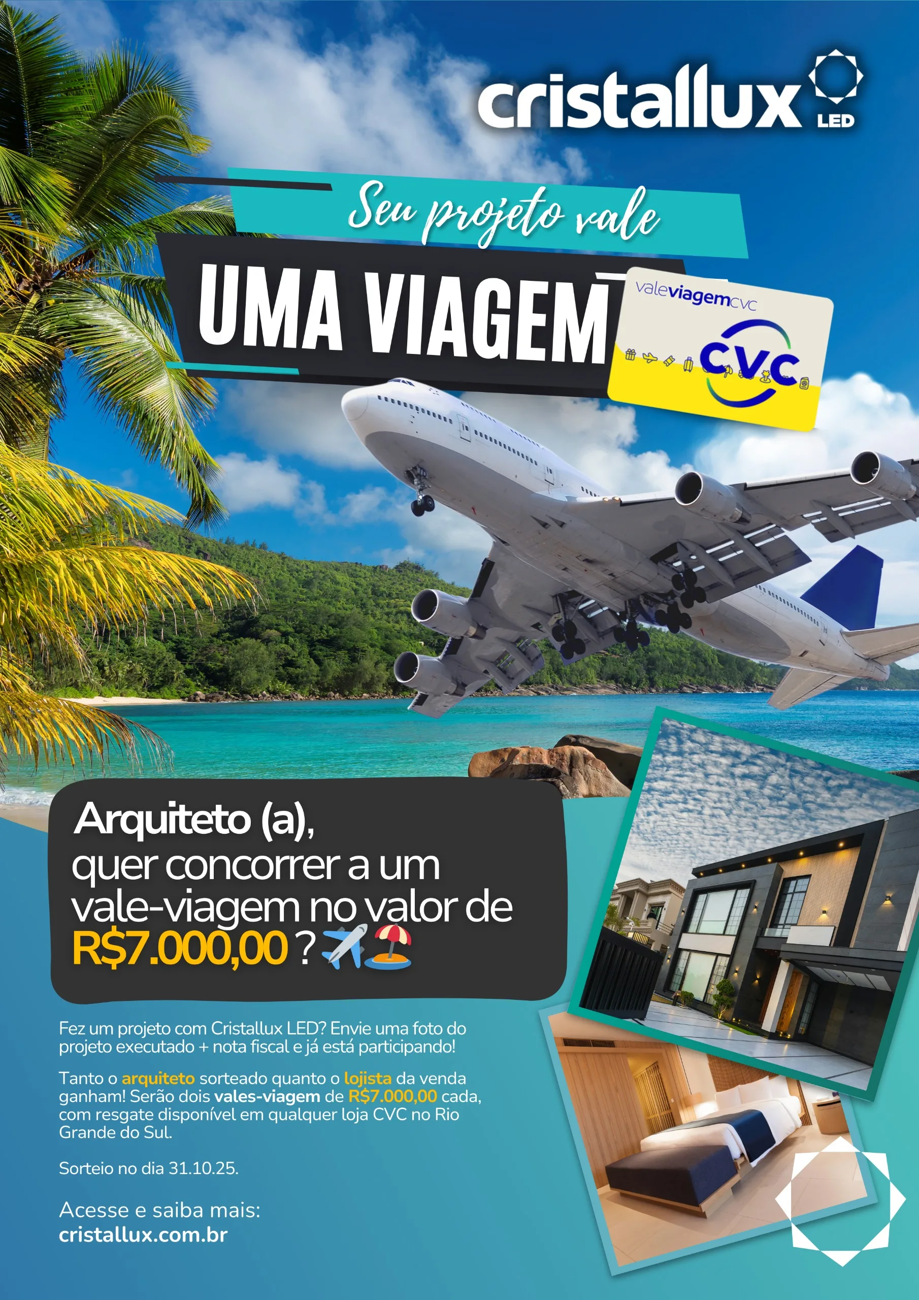 A Cristallux (@cristalluxled), referência em soluções de iluminação LED, apresenta a campanha “Vale-Viagem”, voltada a arquitetos, designers de interiores, engenheiros e lojistas parceiros no estado do Rio Grande do Sul. A ação tem como objetivo valorizar projetos que explorem o design e a inovação dos produtos da marca, premiando os participantes com dois vales-viagem no valor de R$ 7.000,00 cada.