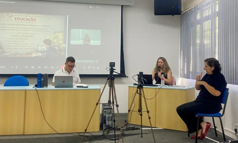 Coerente com a proposta de pensar outras textualidades e práticas inclusivas, a defesa contou com tradutoras-intérpretes de Libras, garantindo a comunicação entre surdos e ouvintes ao longo de toda a sessão. Um dos pontos mais elogiados pela banca foi a organização didática da apresentação, que incluiu mapas conceituais antes de cada capítulo – sintetizando visualmente os argumentos – e um resumo sinalizado em Libras.