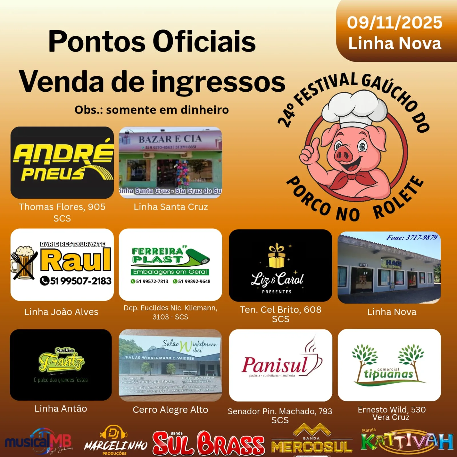 Os ingressos já estão à venda em pontos oficiais distribuídos por Santa Cruz do Sul, Vera Cruz e localidades do interior. A compra deve ser feita exclusivamente em dinheiro, medida adotada para facilitar a organização do evento. Entre os locais de comercialização estão André Pneus, Bazar & Cia, Liz & Carol Presentes, Panisul, Comercial Tipuanas e outros estabelecimentos parceiros.