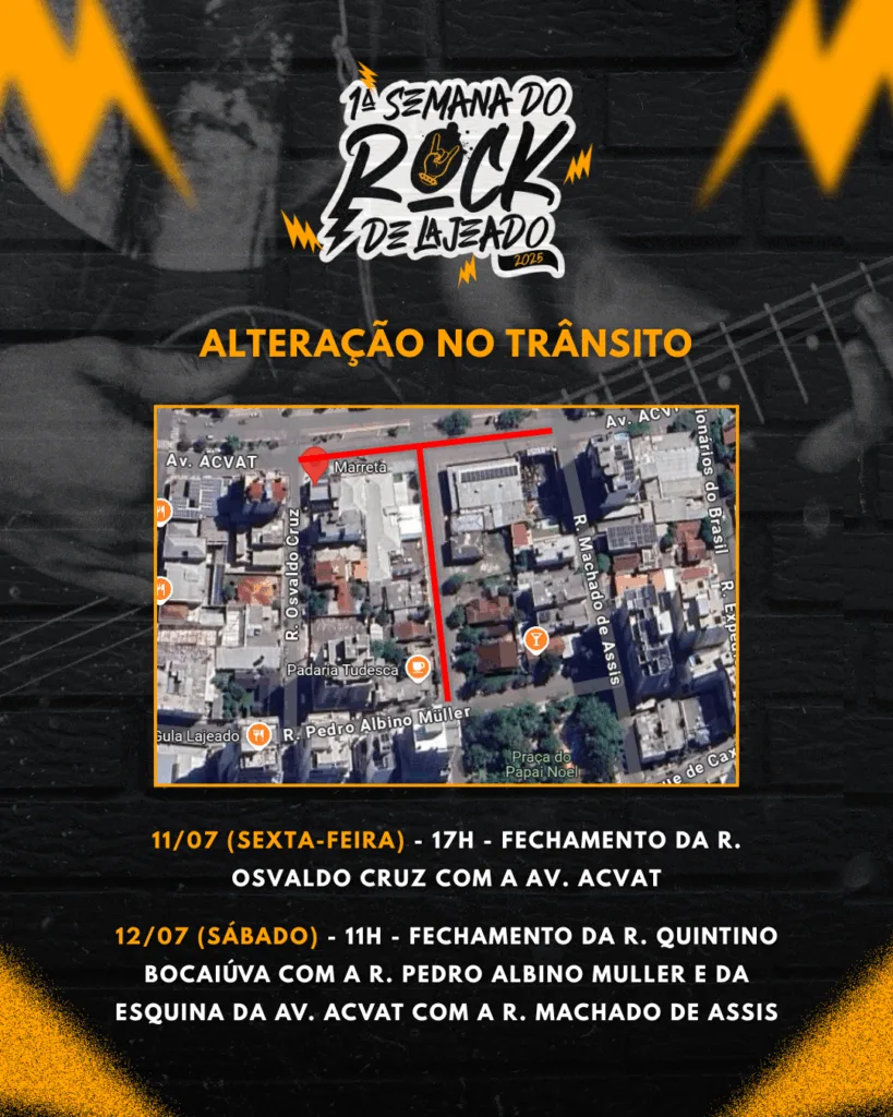 Na sexta-feira, 11/07, a partir das 17h, ocorre o fechamento da Rua Osvaldo Cruz com a Avenida Acvat. No sábado, 12/07, a partir das 11h, ocorre o fechamento da Rua Quintino Bocaiúva com a Rua Pedro Albino Müller, e da esquina da Avenida Aacvat com a Rua Machado de Assis.