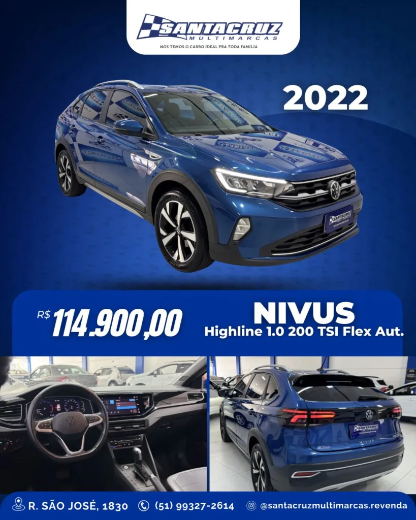 A Santa Cruz Multimarcas amplia as opções de seminovos disponíveis em seu showroom com dois modelos que aliam conforto, tecnologia e performance. Entre os destaques está o Volkswagen Nivus Highline 2022, versão topo de linha equipada com motor 1.0 200 TSI Flex e câmbio automático. O veículo chega ao mercado por R$ 114.900,00 e se apresenta como uma alternativa moderna para quem busca estilo e conectividade.