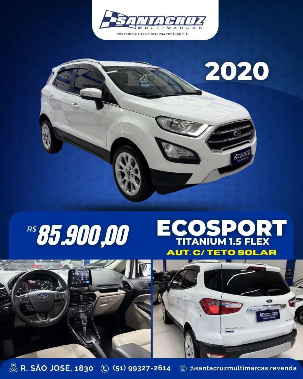 Outra oportunidade é o Ford Ecosport Titanium 2020, ofertado por R$ 85.900,00. O modelo traz motor 1.5 Flex, transmissão automática e teto solar, recurso que garante mais conforto e sofisticação ao utilitário esportivo. A versão Titanium é reconhecida pelo bom nível de acabamento interno e pela versatilidade no dia a dia.