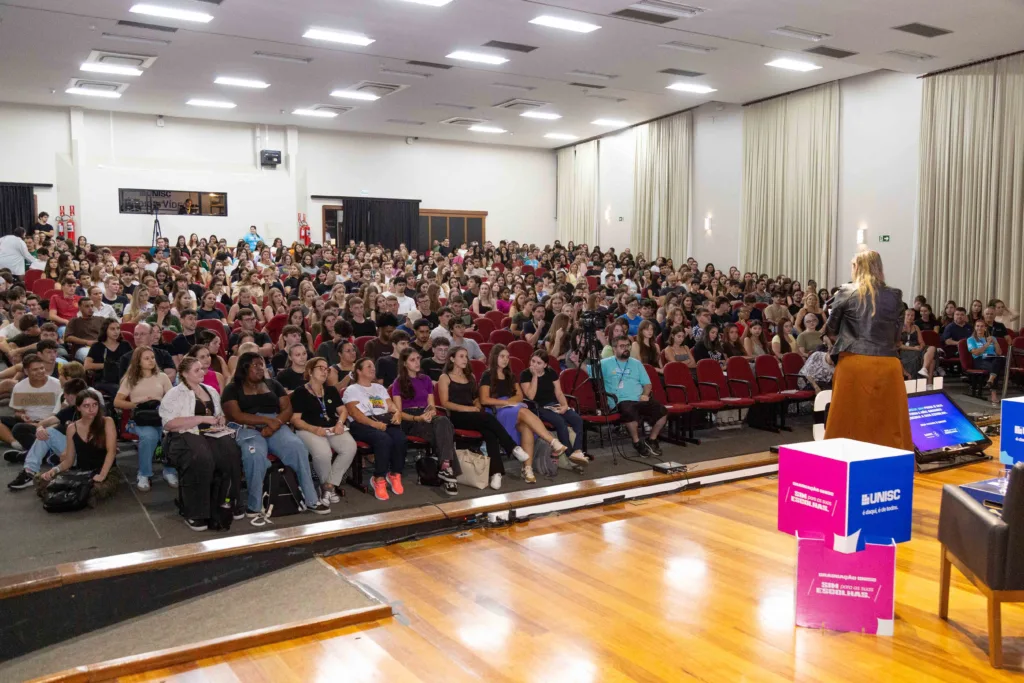 Nas boas-vindas, o reitor da Unisc, Rafael Frederico Henn, começou falando sobre o ‘jeito Unisc’. “Eu, nossa vice-reitora, diretores, pró-reitores vivemos no campus, circulamos, conversamos com os estudantes. Talvez vocês não percebam, mas é muito comum em universidades os alunos não conhecerem o reitor. Mas na Unisc é diferente, fazemos questão de que, logo no início do curso, vocês conheçam a equipe de gestão”, fala.